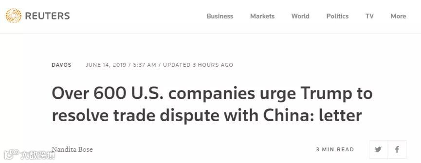 路透社还指出,虽然信中的论点此前已经被许多美国的企业、行业组织和分析人士提出过,但在特朗普近日又宣称想在G20上拿关税继续要挟中国的情况下,这600多家美国企业的集体上书便显得格外有意义。