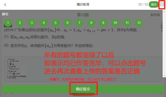 如果题目都做完了的话,点击右上角这个按钮,会弹出进度显示,绿色表示已经上传答案, 确认都上传完毕以后,最终,点击确认提交,作业提交成功。