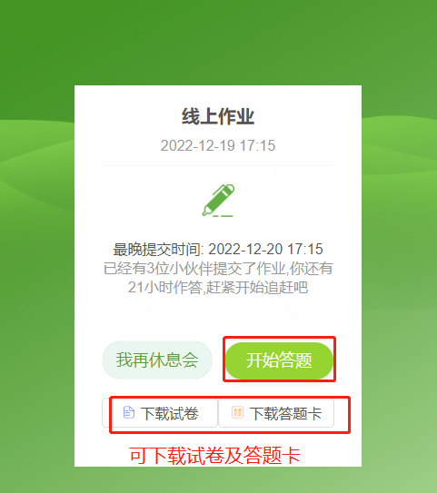 4、进入作业以后,可以选择下载试卷及答题卡查看内容,也可以直接点击开始答题,进入作答。(答题卡可根据情况是否打印,也可白纸作答)