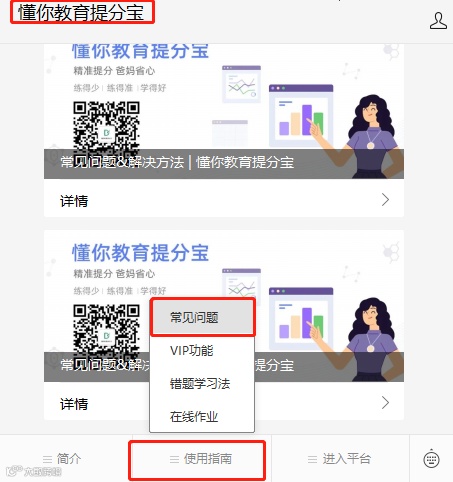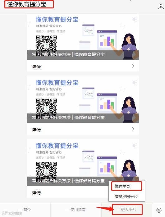 2、微信端:微信关注公众号‘懂你教育提分宝’--右上角‘进入平台’--‘懂你主页’