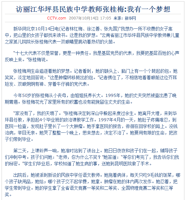 2007年,张桂梅当选党的十七大代表到北京开会时,一位细心的记者发现,张桂梅穿的牛仔裤居然破了两个洞,她开始了解张桂梅的故事。