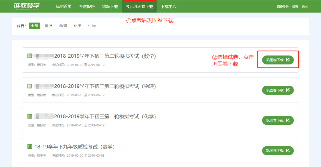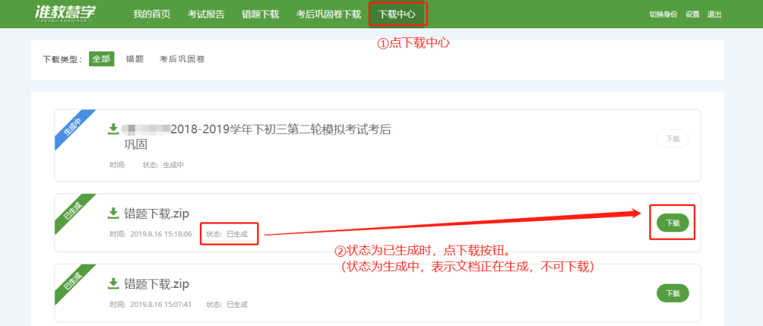 具体操作如下:进入错题下载——选择考试——点击下载——到下载中心查看进度——状态为已生成,点下载按钮即可。