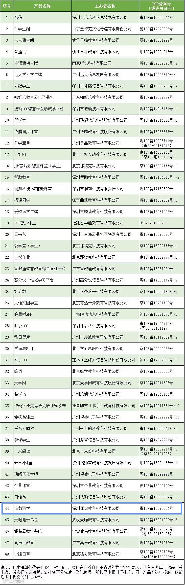 广东省教育厅公告表示,广东省教育厅组织力量统一审查,审查通过后将APP产品列入白名单。经广东省教育厅列入白名单的APP,视同为全省均已备案。对于广东省教育厅审查通过并列入白名单范围内的APP,各地市、县(市、区)、学校和机构可以根据本地区、本单位实际情况,自主决定是否使用该产品,不需要市、县、学校逐级审查。