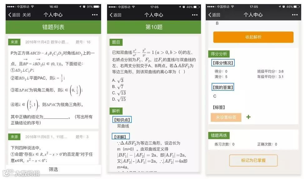 所有的错题都会同步到微信公众平台和pc端的学生家长个人中心;错题整理不仅有原题题干,还提供详细解析,最重要的是还放出了学生的答题过程,多种整理一步到位。