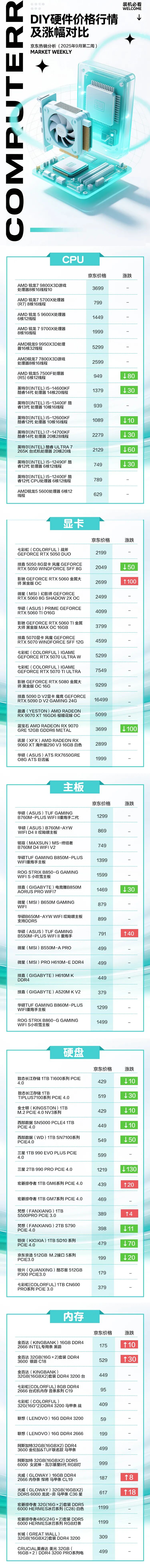 DIY电脑硬件价格行情及涨幅对比:京东热销硬件分析(2025年9月第二周)