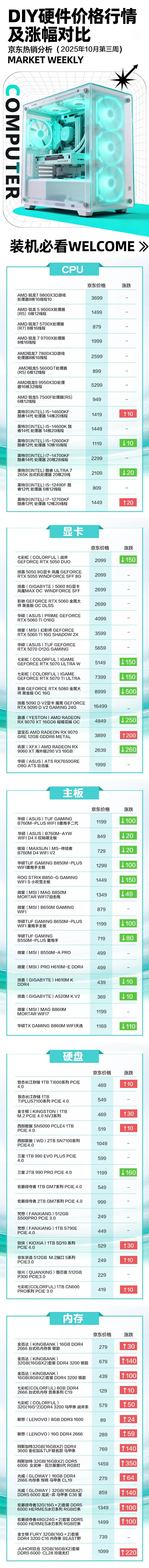 DIY电脑硬件价格行情及涨幅对比:京东热销硬件分析(2025年10月第三周) 造物者AI