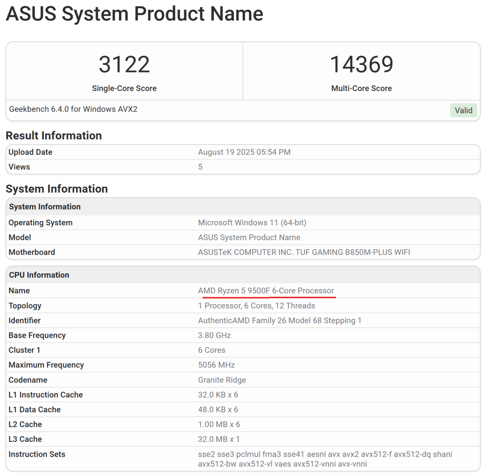 根据Geekbench 6的跑分数据,锐龙5 9500F的单核得分为3122,多核得分为14369,接近锐龙5 9600和9600X的水平,足以满足主流办公与娱乐需求。