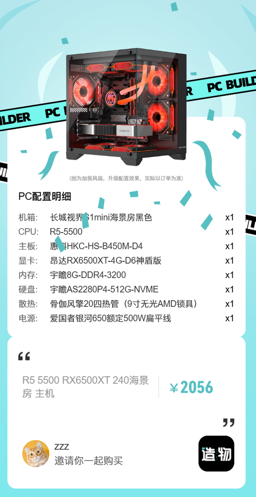 CPU:R5 5500 是一款6 核 12 线程的处理器,主频可达 3.6GHz,睿频最高 4.2GHz,单核性能能满足游戏需求,多核也可应对轻度多任务场景,在入门级 AMD 平台中性价比突出。
