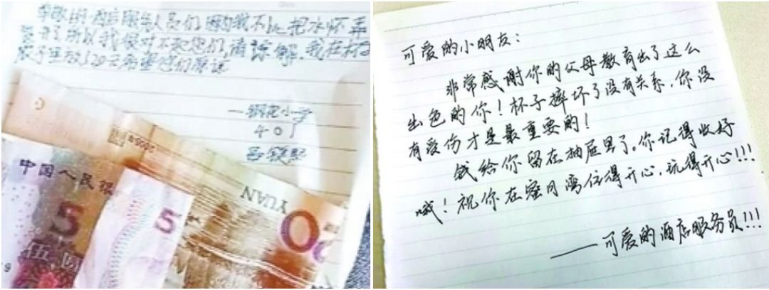 2、小学生酒店摔破玻璃杯主动认错 两张暖心留言条获点赞 6日一名参加活动的小学生入住酒店时,打破一个玻璃杯,主动留下30块钱和一张留言条道歉;酒店为了鼓励孩子的诚信举动,将钱退回并同样留下一张留言条。两张留言条“曝光”后,引来众多网友点赞。(@长江日报)