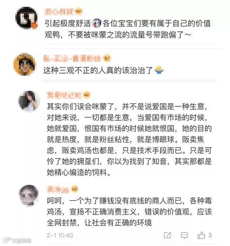 此后,人民日报微博批评咪蒙是“文字商人”、“搞精神传销”。江苏网警也公开点名咪蒙在爱国问题上发表不当言论。