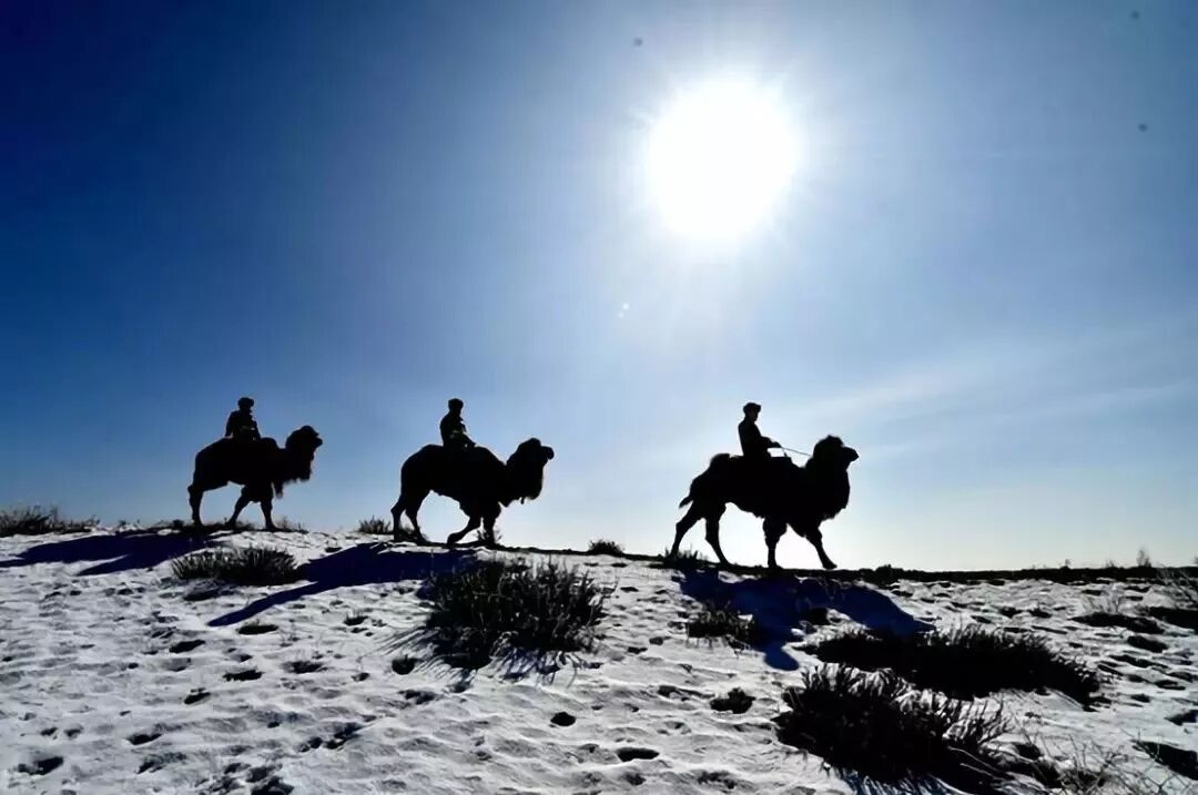 2018年3月6日,新疆维吾尔自治区塔城地区,铁路民警与护路民兵骑着骆驼在新疆奎北铁路巡逻。(宁坚/摄)