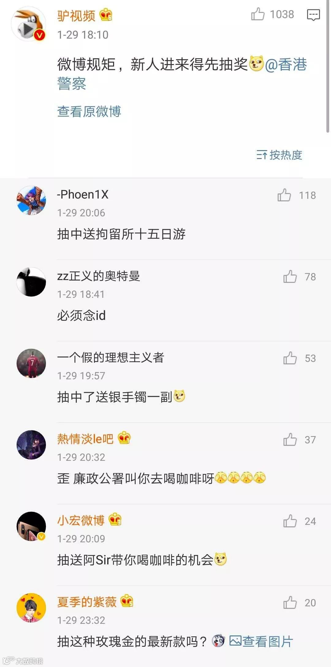 微博开通后,@香港警察随即发布了微博,大陆各地公安微博组团来拜会“小老弟”,评论区被“暗号”刷屏,画片不要太皮。