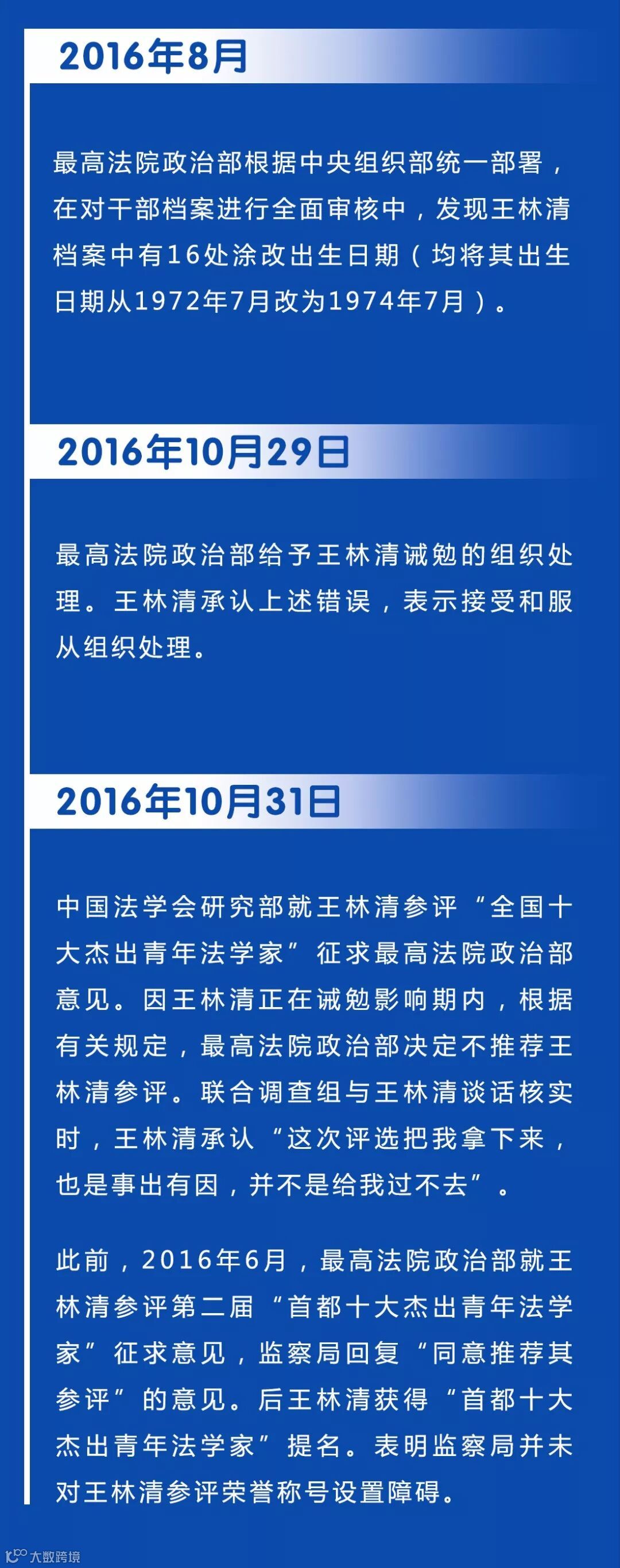 此前,2016年6月,最高法院政治部就王林清参评第二届“首都十大杰出青年法学家”征求意见,监察局回复“同意推荐其参评”的意见。后王林清获得“首都十大杰出青年法学家”提名。表明监察局并未对王林清参评荣誉称号设置障碍。