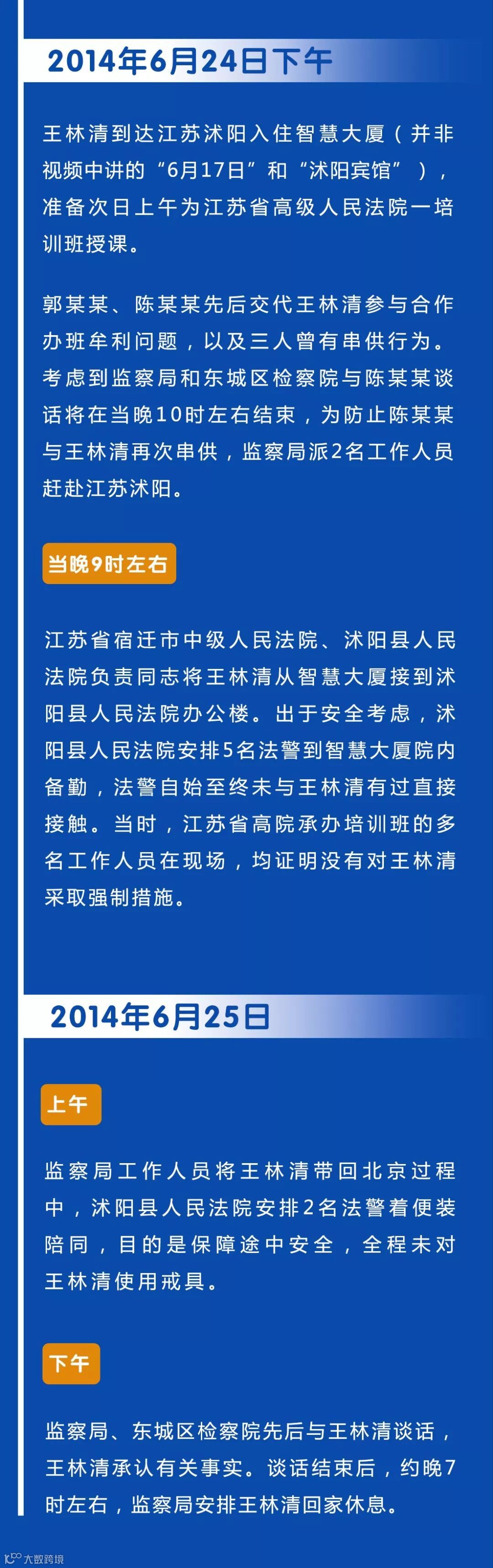 2014年6月下旬,监察局与最高法院机关参与培训班授课的部分法官(包括王林清)谈话了解情况,与王林清两次谈话时,王林清承认参与授课,但否认与陈某某、郭某某有其他经济往来。6月24日下午,王林清到达江苏沭阳入住智慧大厦(并非视频中讲的“6月17日”和“沭阳宾馆”),准备次日上午为江苏省高级人民法院一培训班授课。