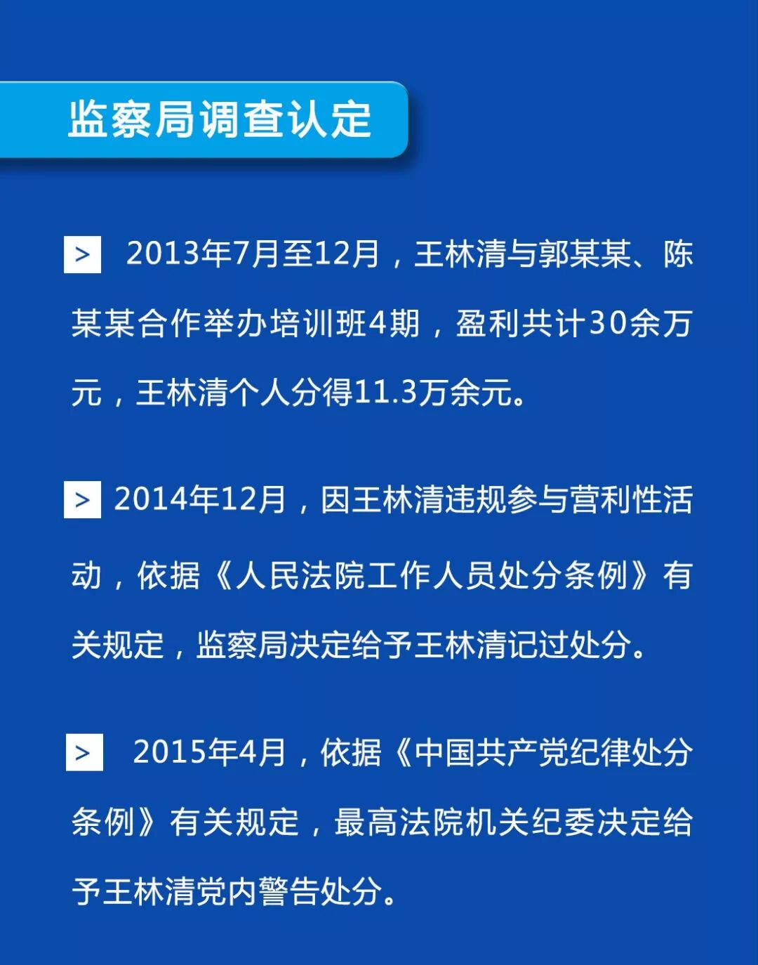 监察局调查认定:2013年7月至12月,王林清与郭某某、陈某某合作举办培训班4期,盈利共计30余万元,王林清个人分得11.3万余元。2014年12月,因王林清违规参与营利性活动,依据《人民法院工作人员处分条例》有关规定,监察局决定给予王林清记过处分。2015年4月,依据《中国共产党纪律处分条例》有关规定,最高法院机关纪委决定给予王林清党内警告处分。王林清在当时的检讨材料中表示:“郭某某之所以愿意和我一起办班,甚至分给我三分之一的利润,一方面是出于他自身经营的需要,另一方面也是考虑我是最高人民法院的法官,利用我成为他们培训班的牌子还是有一定影响力的”;“感谢组织给了我一个自我纠正的机会,我将深刻铭记从此事件中得到的教训,用一生去品味它的前因后果,并用它去衡量要做的每一件事”。联合调查组与王林清进行谈话核实时,王林清承认在视频中反映的“打击报复”问题与客观事实不符,表示“我现在知道了,监察局实际上是要调查陈某某的,不是冲着我来的”。