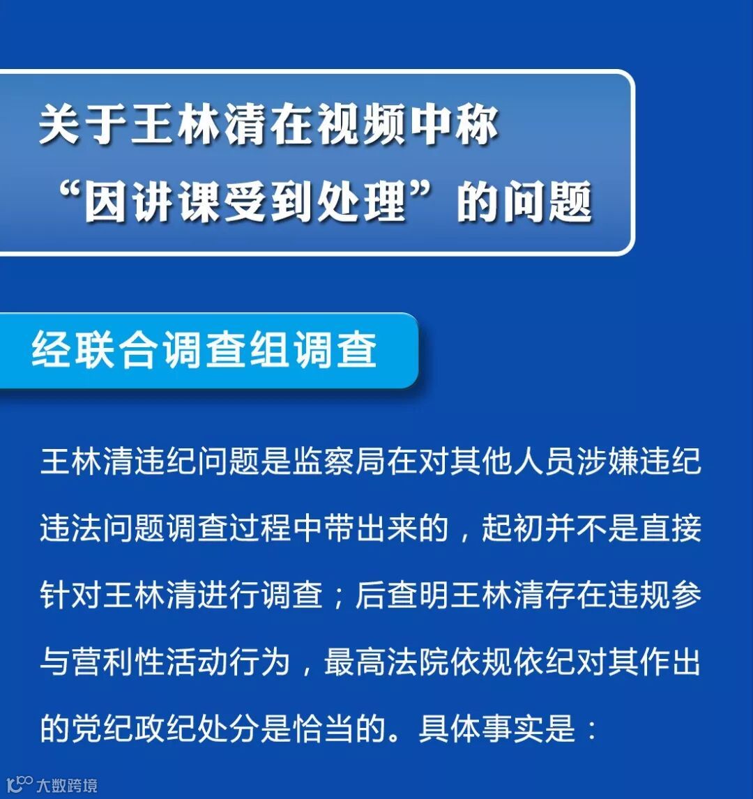 关于王林清在视频中称“因讲课受到处理”的问题,经联合调查组调查,王林清违纪问题是监察局在对其他人员涉嫌违纪违法问题调查过程中带出来的,起初并不是直接针对王林清进行调查;后查明王林清存在违规参与营利性活动行为,最高法院依规依纪对其作出的党纪政纪处分是恰当的。具体事实是: