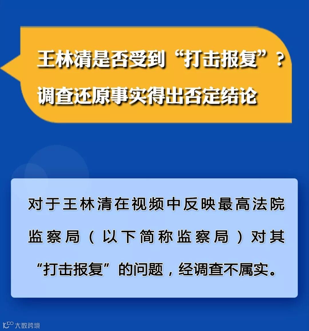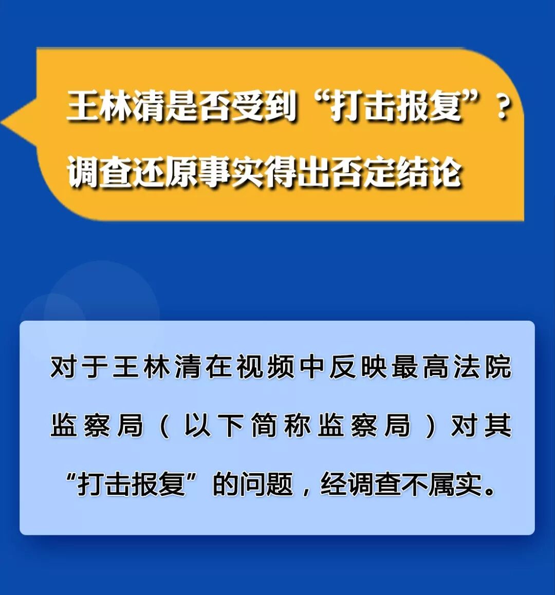 对于王林清在视频中反映最高法院监察局(以下简称监察局)对其“打击报复”的问题,经调查不属实。