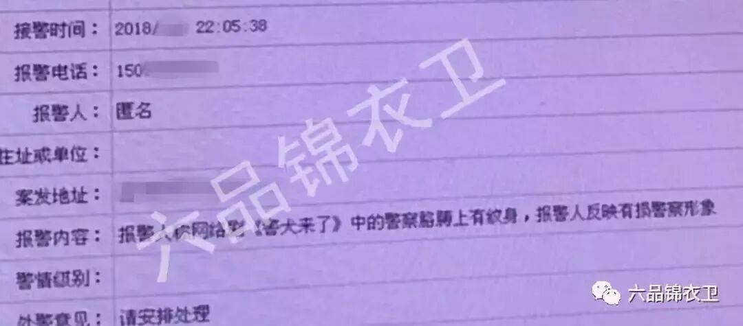 报警:网络剧《警犬来了》中的警察胳膊上有纹身,报警人反映有损警察形象,请安排处理。