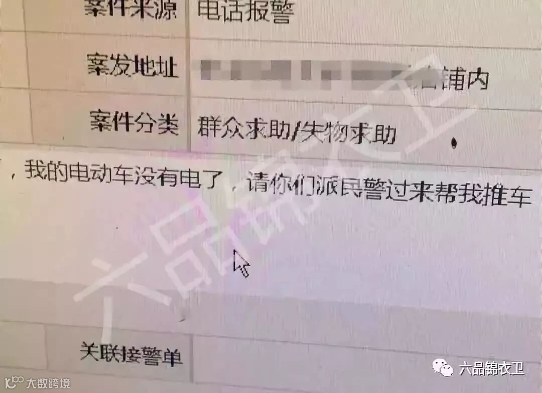 报警:电动车没有电了,请派民警过来帮忙推车。