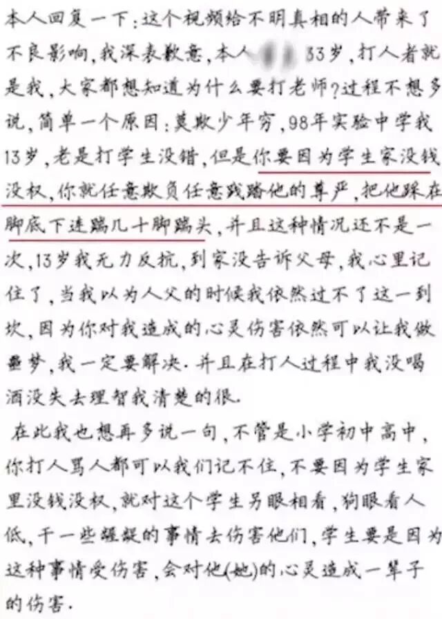 称其今年33岁,打老师时既没喝酒也没失去理智,只因20年前13岁(1998年)在栾川县实验中学读书时,因家里没钱没权,被该老师任意欺负践踏尊严,多次把他踩在脚底下连踹十几脚并踹头,对他的心灵造成了一辈子的伤害。