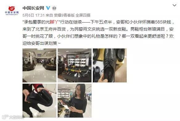 当天下午5点半,安哥和他的小伙伴怀揣着众筹来的鞋款,来到北京王府井百货,并将不同款式的鞋子拍照上传,请网友一同出谋划策。