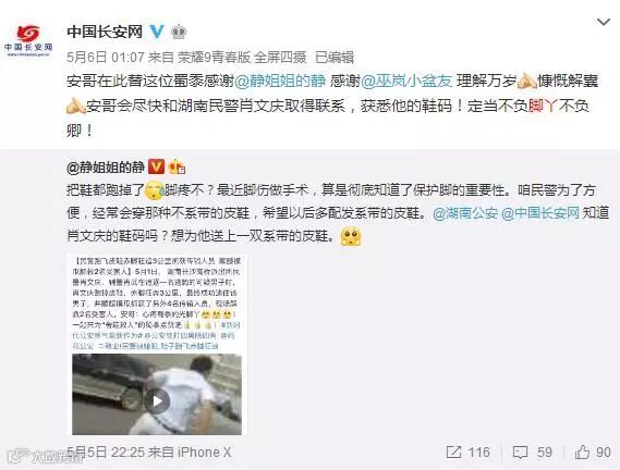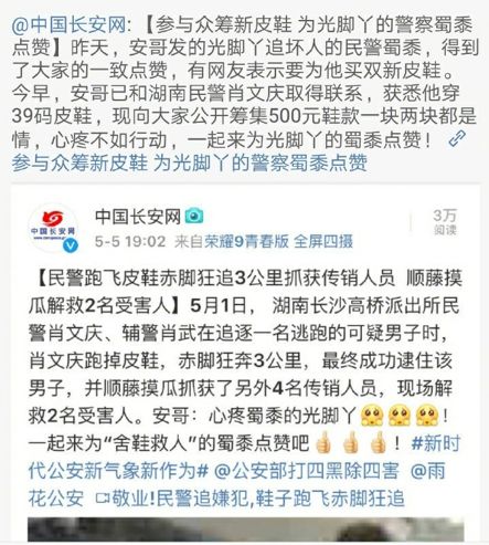 @中国长安网向他表示感谢,表示“会尽快和湖南民警肖文庆取得联系,获悉他的鞋码!定当不负脚丫不负卿”。
