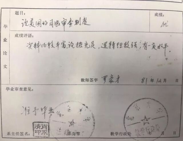 罗豪才当年担任北大法律系讲师,为北大77级法律系学生陶景洲毕业论文写的评语。