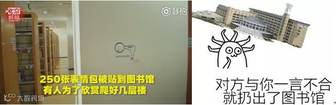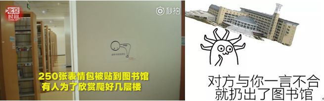 3、为欣赏表情包爬楼 近日,河南某高校图书馆各角落被数百张搞笑“表情包”占据。有人为了欣赏图片爬好几层楼,一些从不去图书馆的同学也忍不住跑去看。(@时间视频)