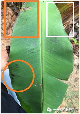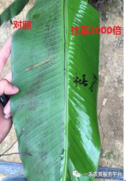 将香蕉叶进行半叶处理对比,5天后喷施社喜2000倍的半片叶片明显得到完美保护,黑星病不再蔓延扩散,叶片油亮有光泽;在看未施药的半片叶,黑星病严重扩散蔓延,颜色加深,病情严重恶化。