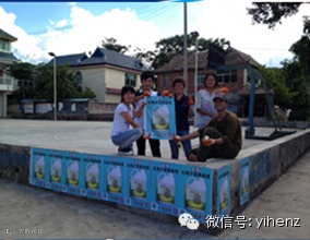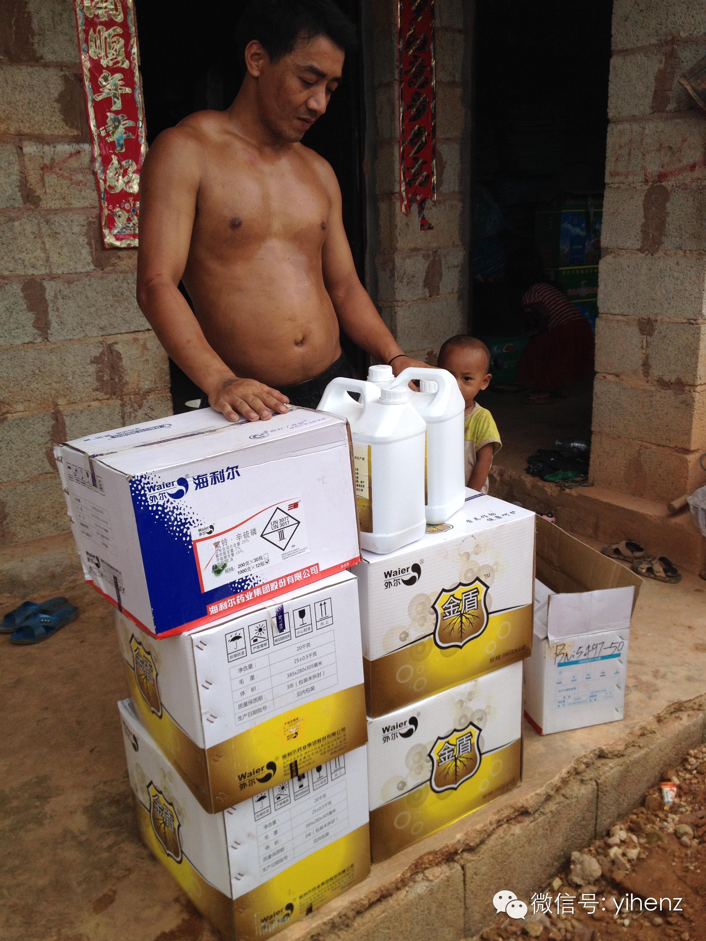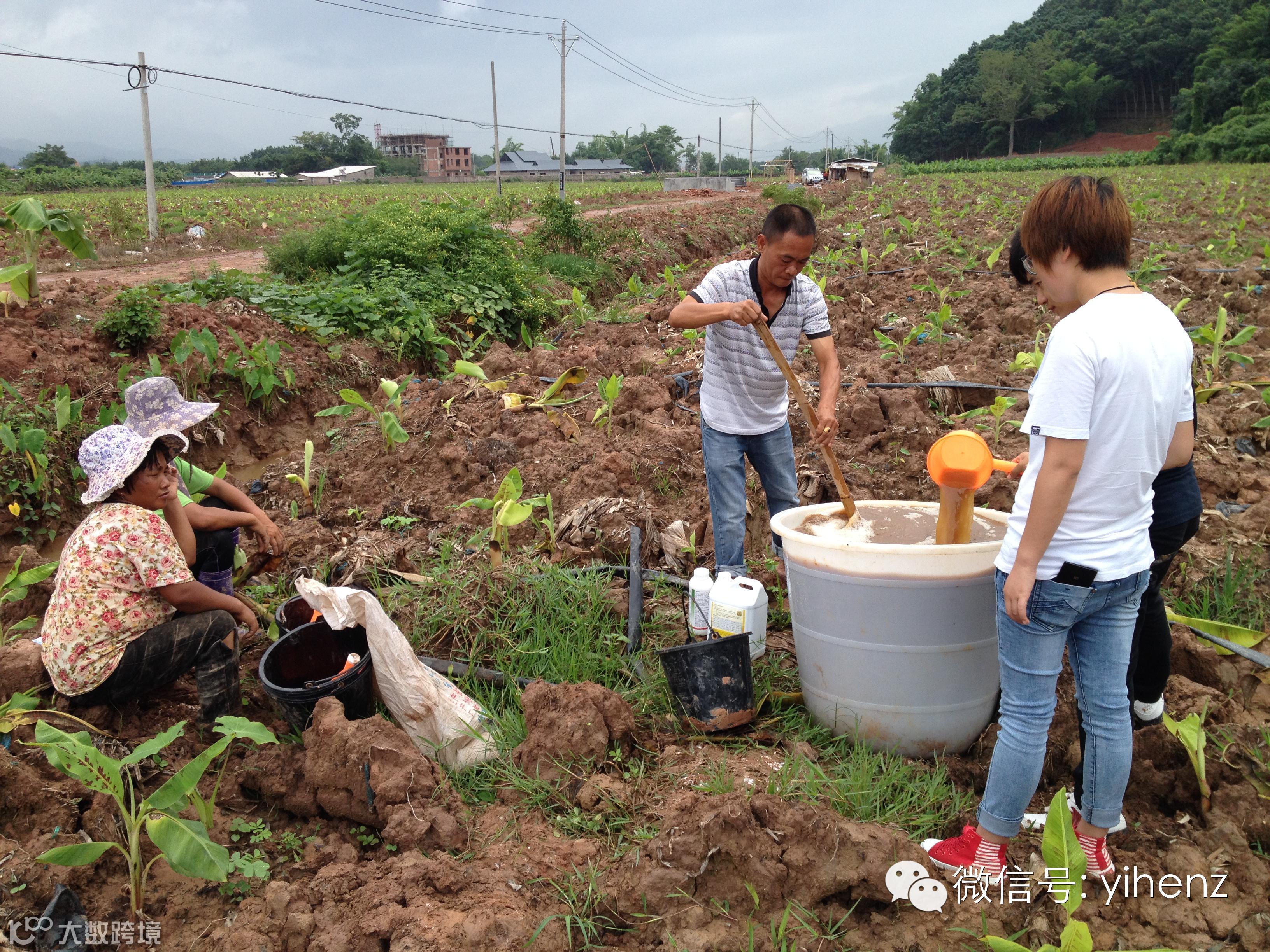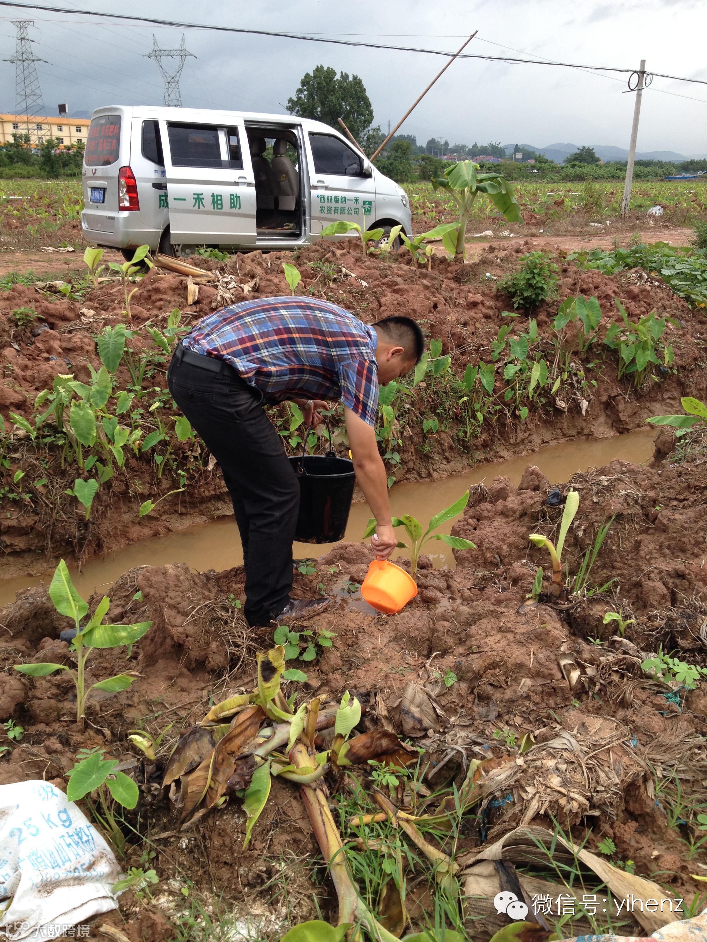 在打洛五分厂做用金盾灌根香蕉苗的示范试验 ,我们的技术人员正在专心致志的配置农药