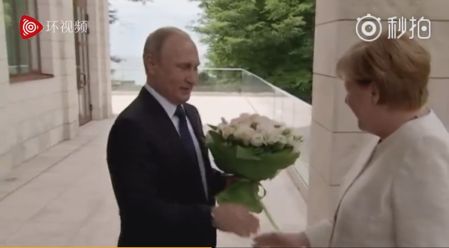 3、普京展开魅力攻势:手捧玫瑰迎接访俄的默克尔 “俄罗斯总统普京18日会见德国总理默克尔时,似乎发起了魅力攻势”。据报道,普京当天手捧一大束粉白鲜花,面带微笑在索契私人官邸的入口处迎接访俄的默克尔。(@环球网)
