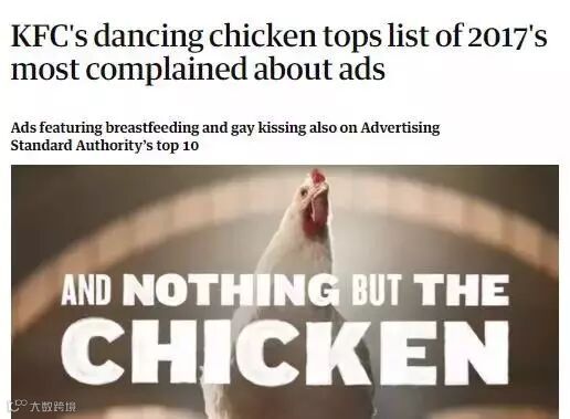 4、肯德基广告在英国惹麻烦 据英国《卫报》1日报道,肯德基这部争议广告名为《全鸡》,展现的是一只毛色鲜亮的健康肉鸡随着饶舌乐节拍“翩翩起舞”的场景。反对者认为“嘻哈鸡”演绎的是一曲“死亡之舞”,因为“它之后就要被送进屠宰场”,这部广告是“对鸡的不尊重”。(环球时报)
