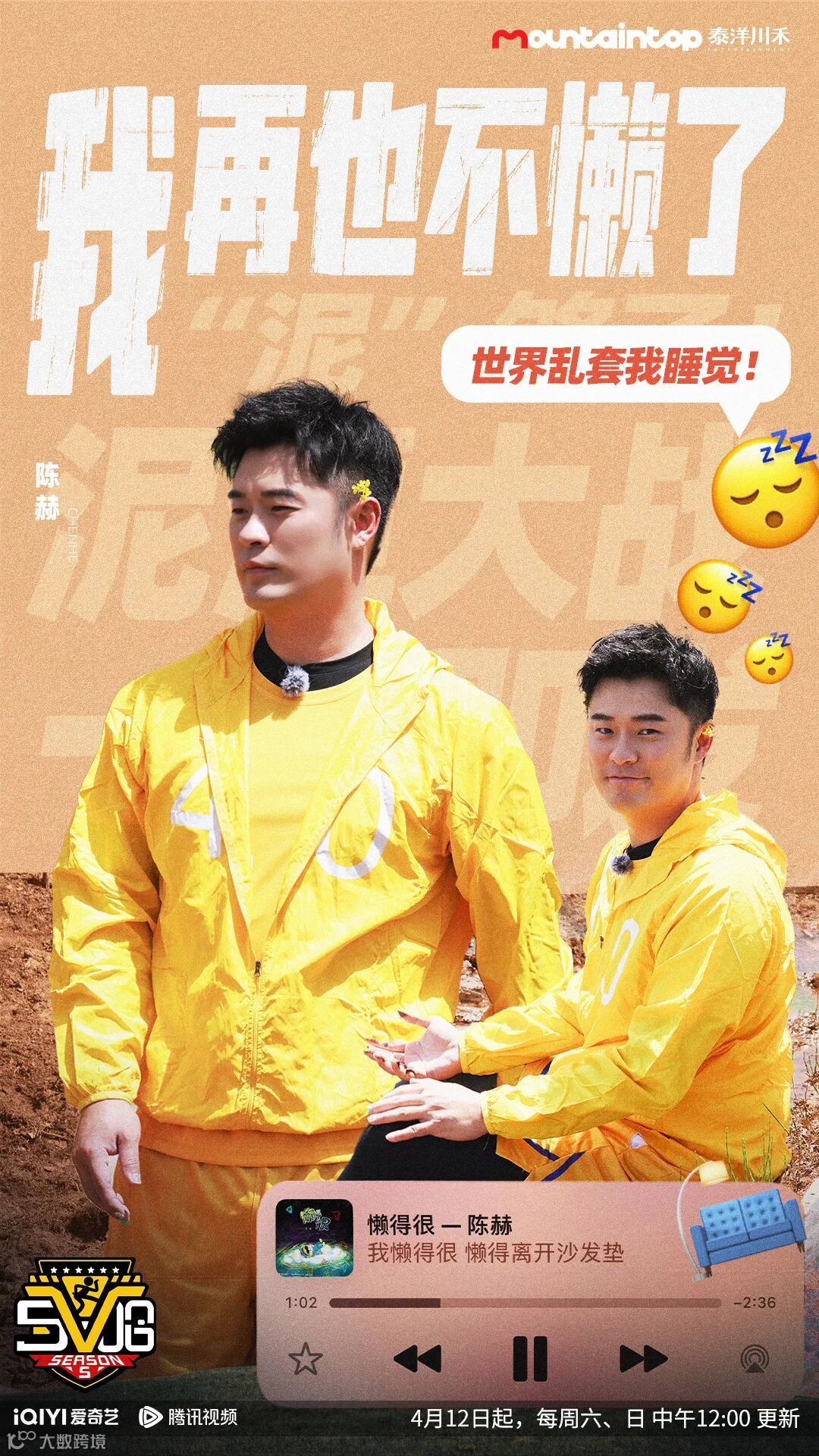 “我再也不懒了”运动会开幕,五哈vs种地花式battle泥潭混战。看陈赫、王勉“幸运出逃”饭量PK逃离火锅店,解锁奶油造型大赏!每周六、日中午12:00锁定爱奇艺、腾讯视频,精彩播出。