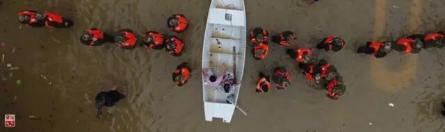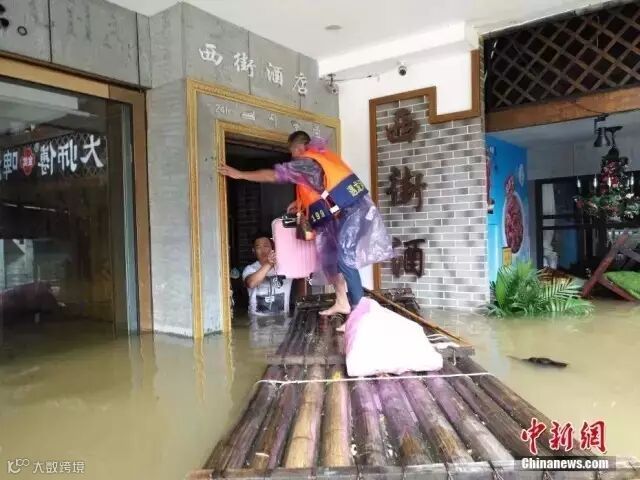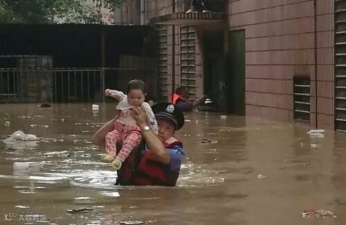 湖南娄底市一名警察托举着一个婴儿在齐胸深的洪水中小心翼翼地艰难前行。