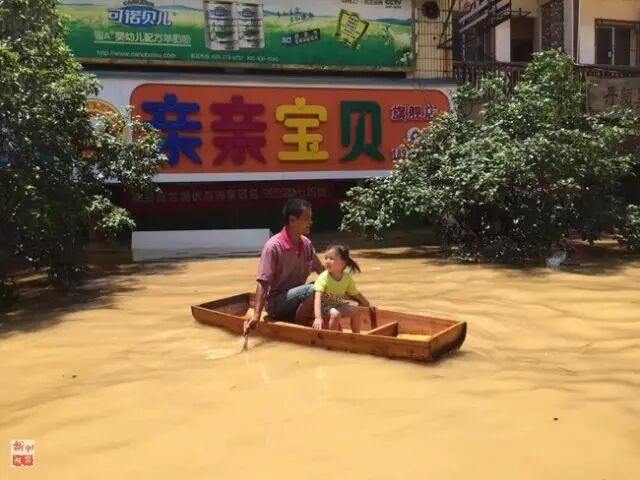 在广西融水苗族自治县县城,居民划船在街道上行进(7月2日摄)。新华社记者卢羡婷摄