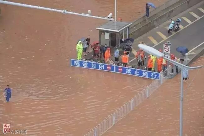工作人员在湖南长沙一处被洪水包围的过湘江隧道入口处设防(7月1日摄)。新华社记者龙弘涛摄