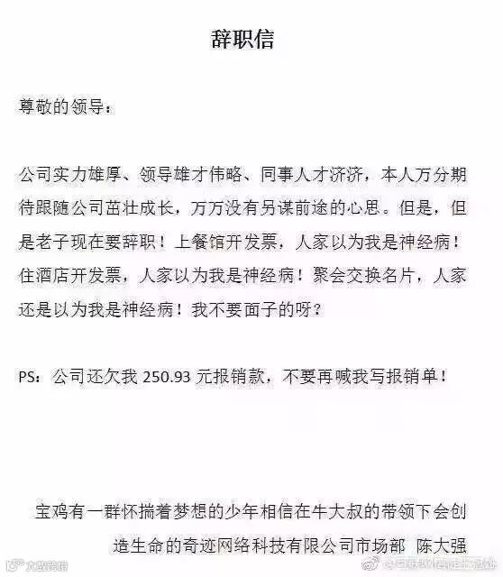 ▲这是微博上爆出的该公司内部员工的辞职信,看了辞职原因小编只想微笑▲