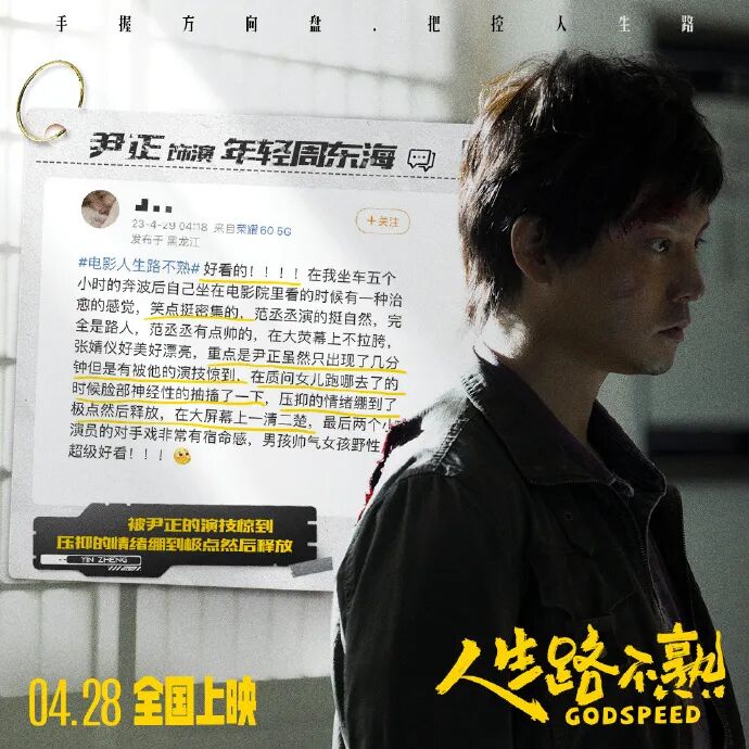 周三,尹正友情出演的电影《人生路不熟》票房突破5亿,斩获五一档期票房冠军。该片讲述了一家四口意外开启的一段有笑有泪的卡车之旅。尹正在片中饰演年轻周东海,细腻演技广受好评。