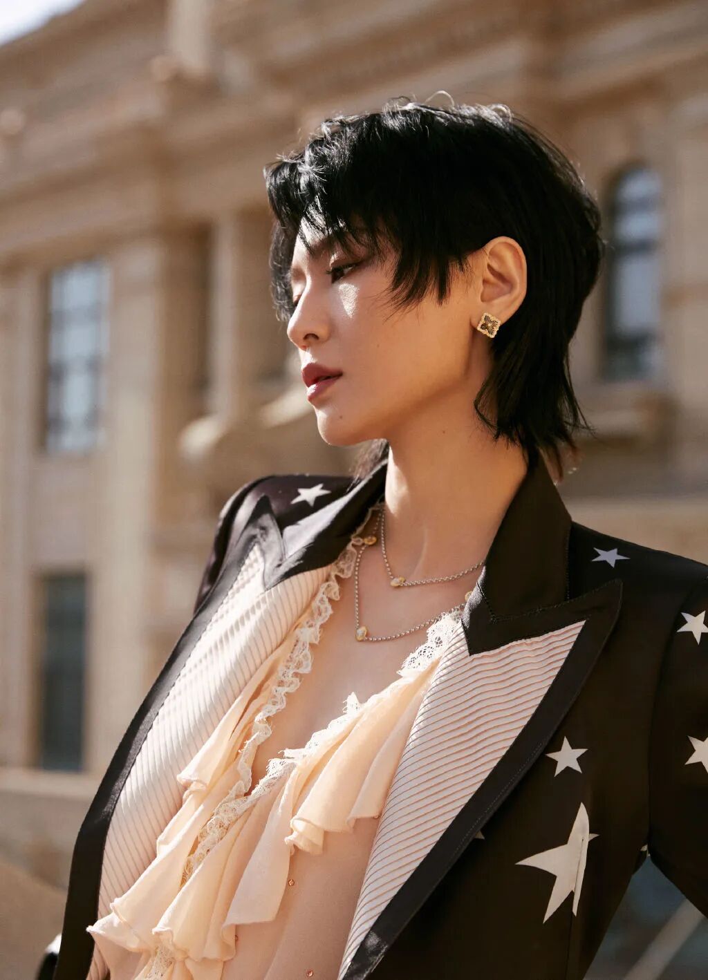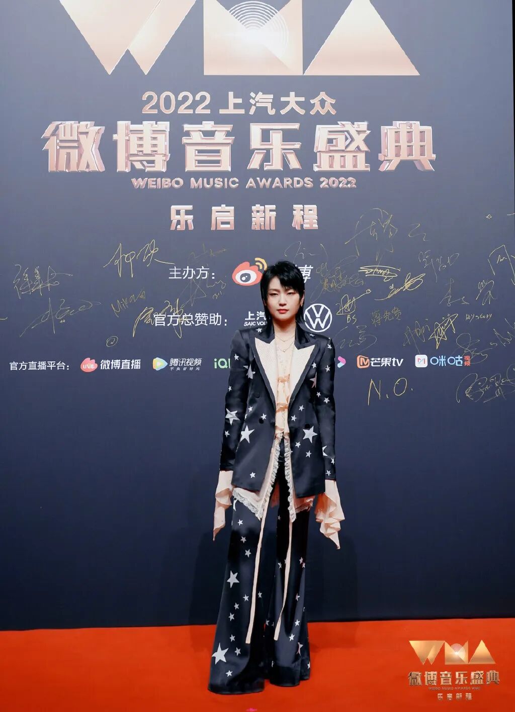 上周三,周笔畅着缎面星空西装出席了2022微博音乐盛典,并获得了“年度热度歌手”的荣誉。