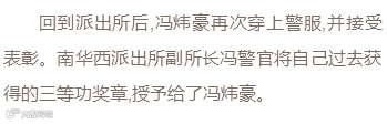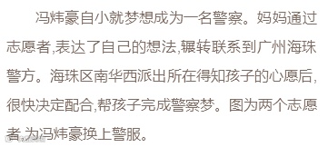 据悉,这次圆梦行动,南华西派出所出动了十几名警察,此外还有社会上的志愿者叔叔阿姨。让冯炜豪妈妈颇为感动,也让现场很多人倍感温暖。
