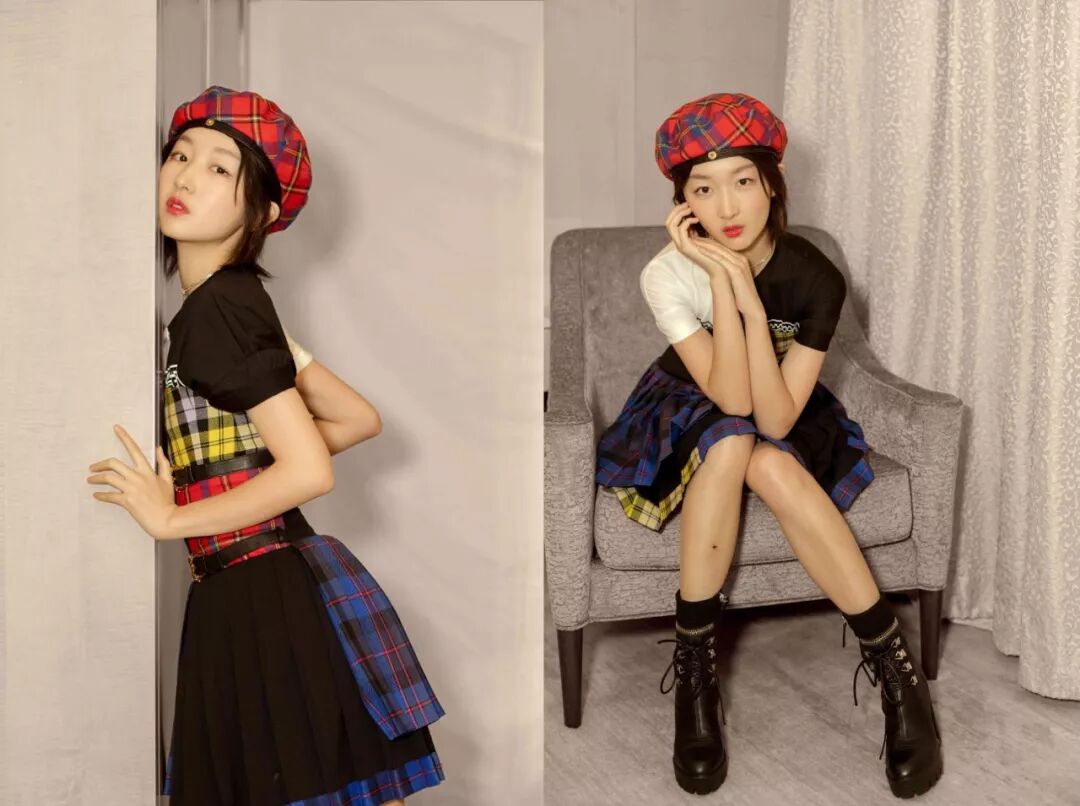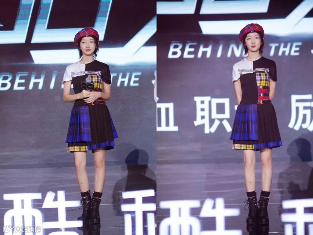 秋推会上,周冬雨身着拼色T恤蓝色格子短裙,头戴红色贝雷帽,俨然一副元气少女模样,非常符合她在剧中的前期形象。