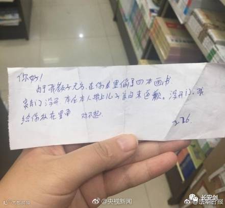 5、儿子顺走漫画书 母亲送还书款,留信自责 2月26日一早,衢州市一书店店员开门营业时,发现门缝里塞了一张纸条和40元钱,上面写:“我教子无方,儿子在你店里偷了四本画书。本应带儿子来道歉,没开门,对不起。”店员说:“孩子难免犯错,家长能以身作则,给予引导非常难得。”(央视新闻)