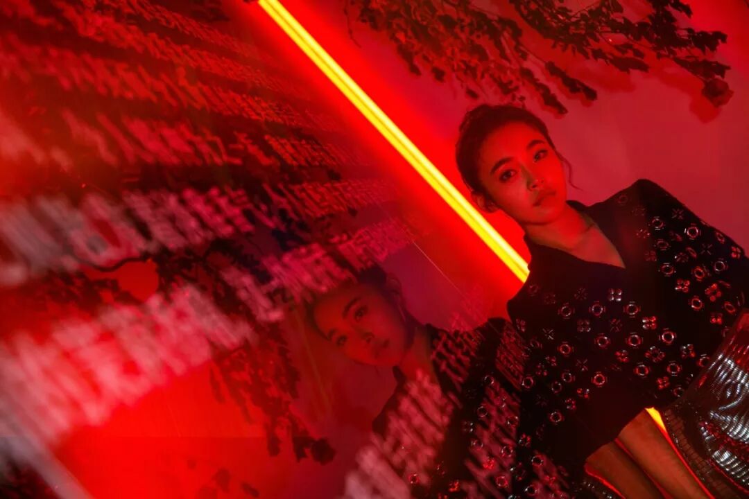扎起丸子头的张佳宁更是灵动俏皮,满满的邻家少女气息,看着舒服又时尚。在现场红色光影的包裹下,这身造型显出几分华丽妩媚。