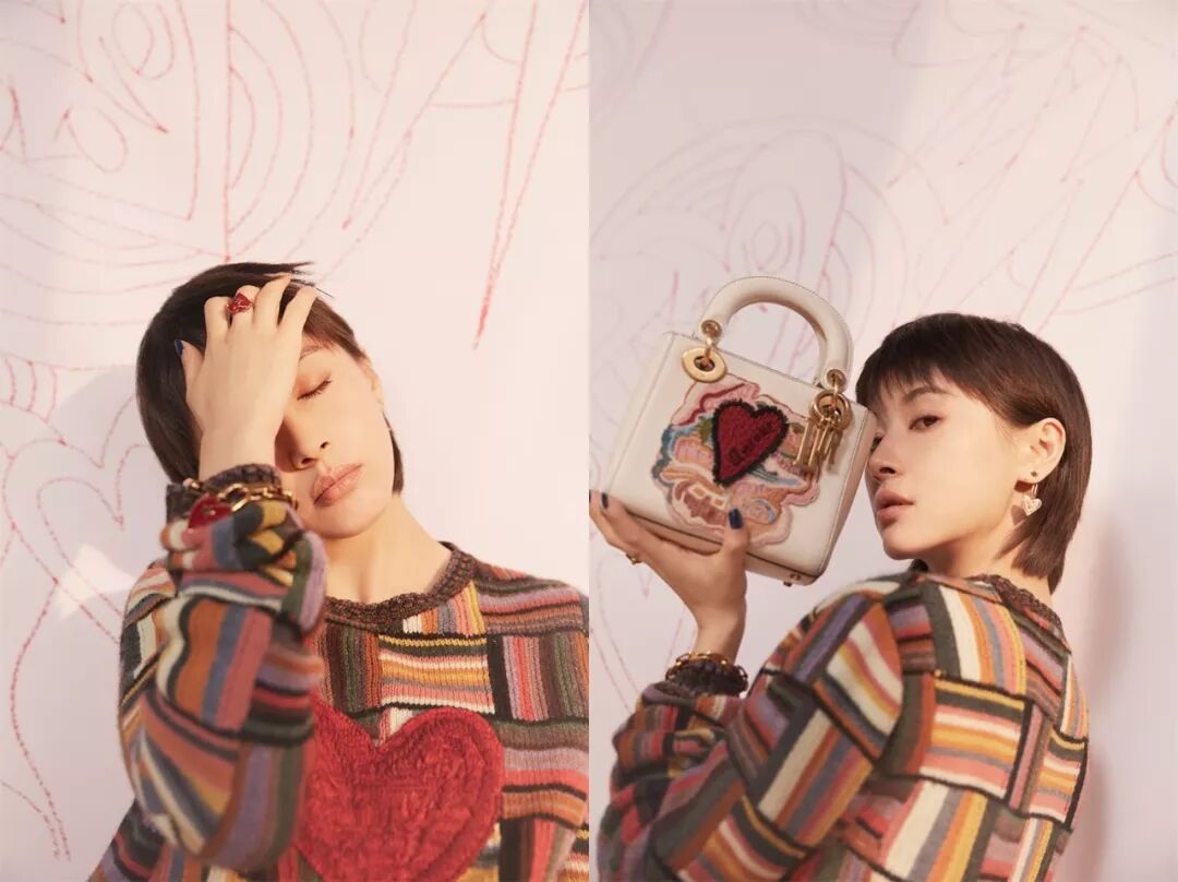 王子文身着饰有象征爱情的心形针织毛衣与肩带缀以爱心图案徽章的DIORAMOUR黑色漆皮My Lady Dior手袋相得益彰,完美诠释浪漫甜蜜的可人气质。