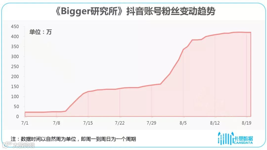 7月,《Bigger研究所》在抖音展示出了强势的增长动力——一个月增粉400万,并顺利承接定制广告。由此上榜卡思数据抖音新锐榜(2018.7.30-8.5周)TOP2,上升潜力显著。