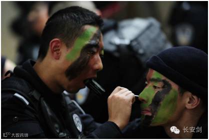 出场前,特警总队的小伙子在脸上涂抹迷彩。