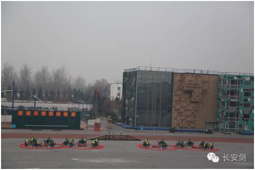 下面这张图,是摩托车“8字”绕行。10辆车同时在“8字”内行驶,要求前后间距一致、速度一致、动作一致,通过此项训练有效提高队员弯道驾驶水平。