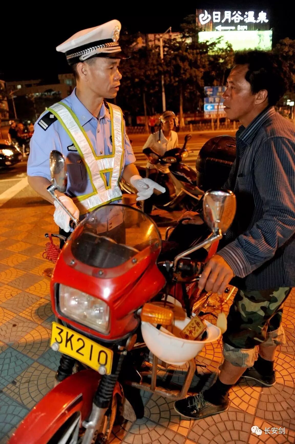 “同志,你没戴安全头盔,请下车接受处罚。”