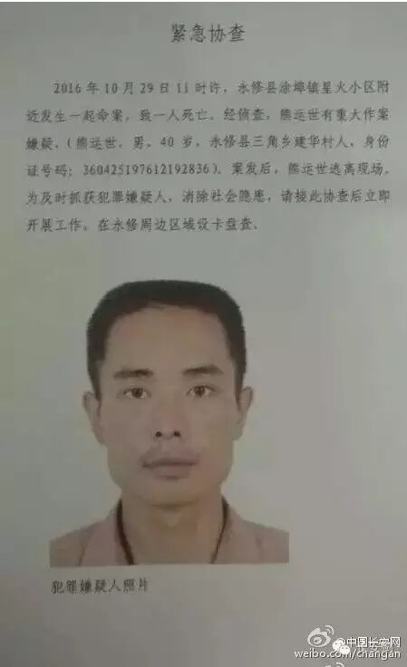 永修县公安局消息称,命案发生地点位于永修县涂埠镇星火小区附近的顺发超市门口,事发后犯罪嫌疑人逃离现场,刑警大队民警赶到现场时,经120医生确认,受害人黄桂富已经死亡。当地公安通报一名熊姓男子,其有重大作案嫌疑,且在案发后逃离现场。