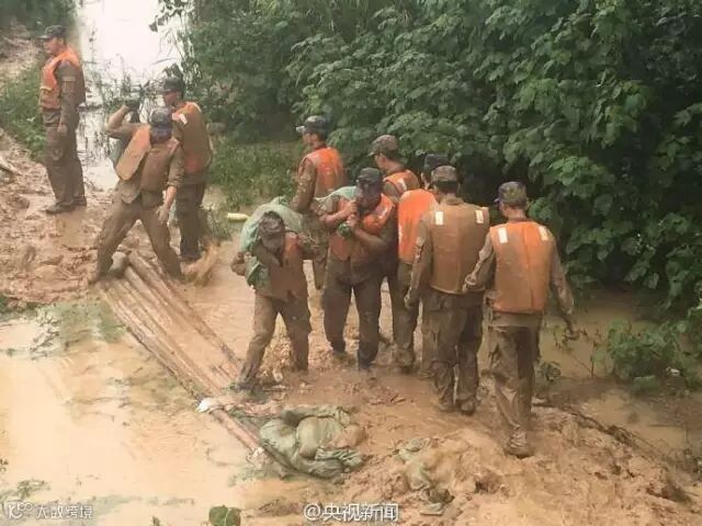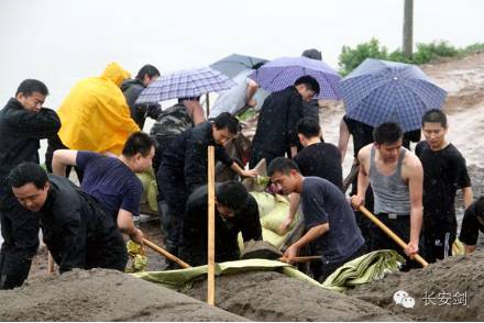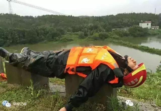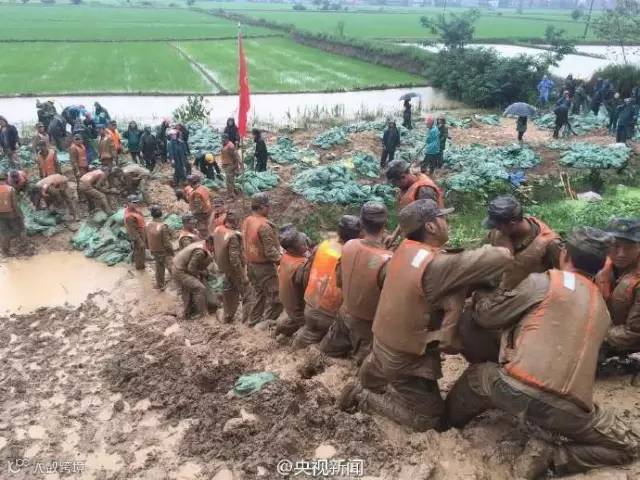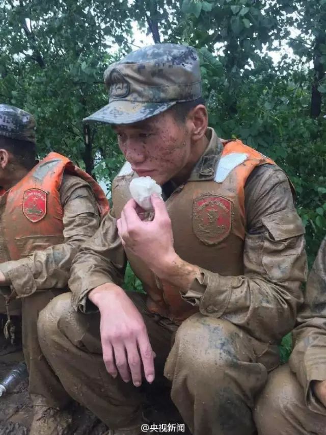 “大雨滂沱里,他们不穿雨衣;为了运沙袋,他们浑身是泥,里外湿透;六十斤的沙袋,他们每个人扛三百个,来回跑六百趟;混着雨水的矿泉水和几个馒头,就是他们日常的伙食……哪里有危险,哪里就有抗洪抢险的战士们。致敬!”@央视新闻